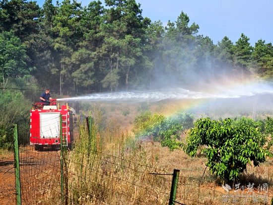 由于通行的路較窄,消防救援人員只能使用小型水罐消防車(chē)往返運(yùn)輸,保障30余畝果苗的澆灌用水。在鋪設(shè)水帶、連好水槍后,消防員們站在消防車(chē)車(chē)頂開(kāi)始給柑橘苗種植區(qū)域進(jìn)行澆灌,只見(jiàn)一條“水龍”從水炮口噴射而出,在田間下了一場(chǎng)“及時(shí)雨”。