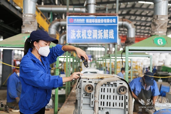劉國(guó)平介紹,今年1至7月份,包括電視、冰箱、洗衣機(jī)、空調(diào)和電腦在內(nèi)的“四機(jī)一腦”共拆解57.85萬(wàn)套,廢舊汽車(chē)回收拆解509臺(tái),小家電拆解6283噸。去年,企業(yè)拆解舊家電超過(guò)100萬(wàn)臺(tái),產(chǎn)出金屬銅3000噸,“相當(dāng)于中色大冶的第五座礦山”。