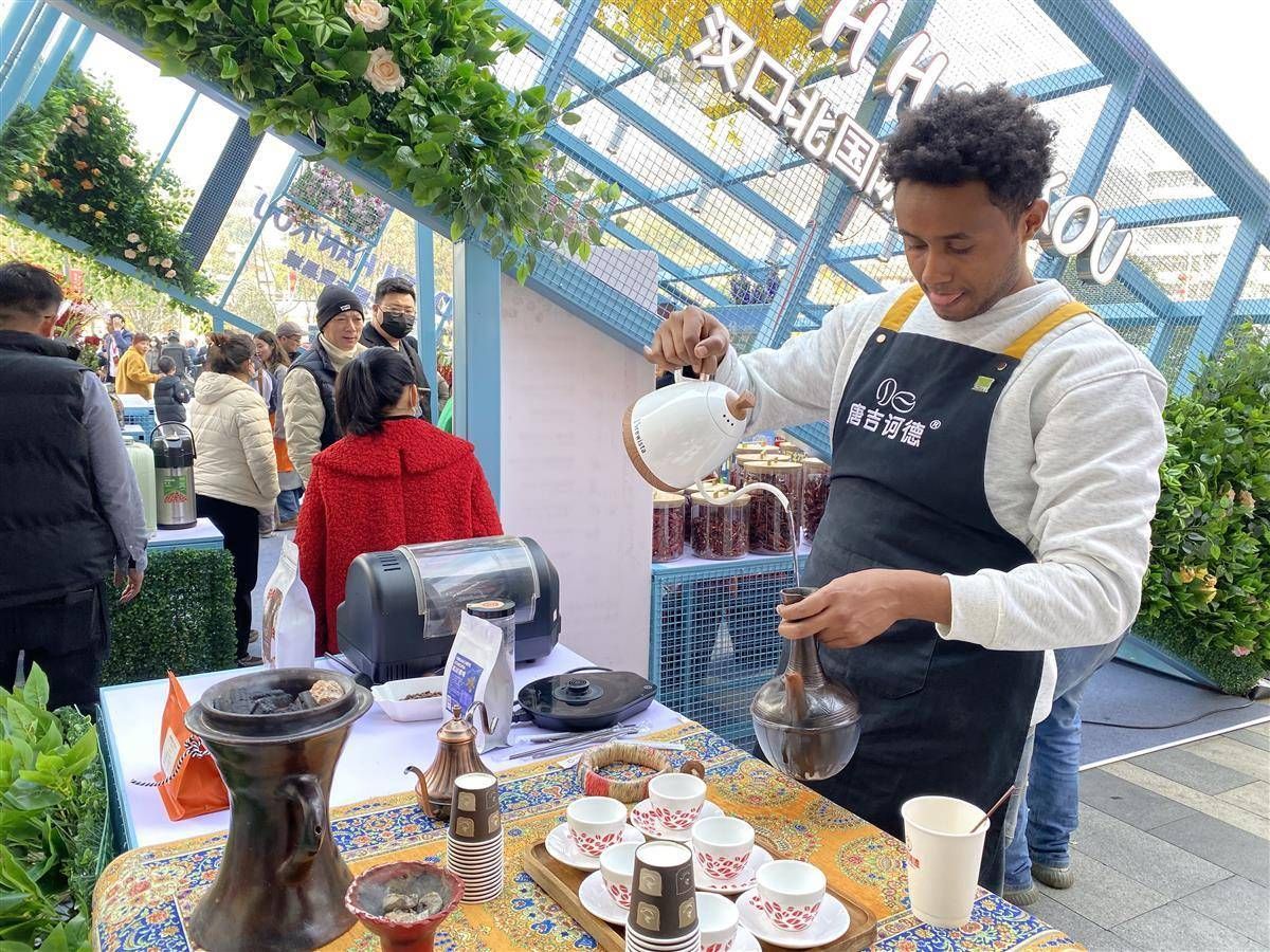 在武商夢(mèng)時(shí)代“國(guó)潮好物市集”,埃塞俄比亞小伙貝卡·麥勒斯(Beka Melese)正在手沖咖啡招待顧客。(記者劉天縱攝)