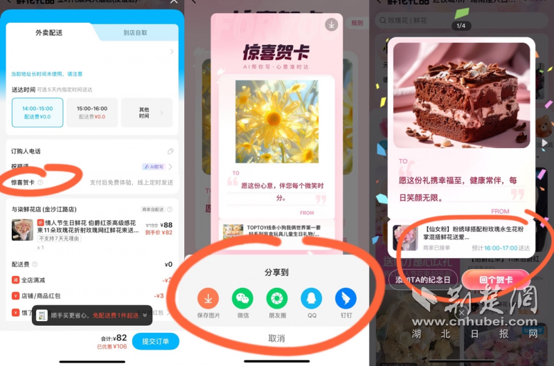 今年情人節(jié)前夕,驚喜賀卡的功能范圍也從單一的禮品頻道擴大到全域熱門禮品商品。當消費者選擇好禮品和對方的收禮地址,提交訂單后即可定制驚喜賀卡并分享給對方,對方能實時看到賀卡及禮品的配送狀態(tài),還可以回贈賀卡。