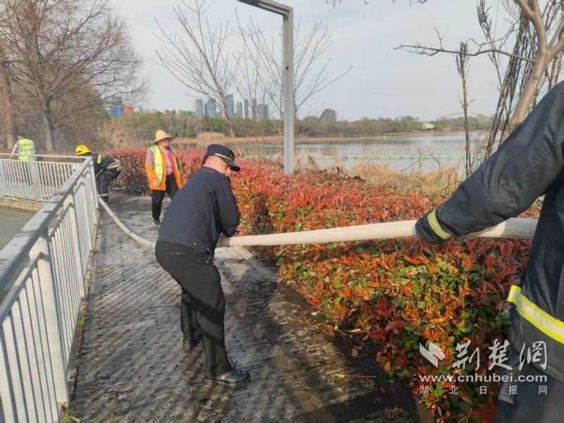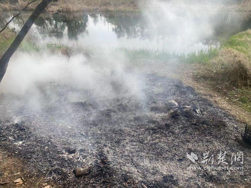 當(dāng)日下午,東湖風(fēng)景區(qū)城管執(zhí)法局四中隊(duì)隊(duì)員王建偉、宋威、劉鑫宇在九女墩附近巡查時(shí),發(fā)現(xiàn)華僑城運(yùn)動(dòng)中心南山草木集門店附近有濃煙升起。他們迅速趕到現(xiàn)場,發(fā)現(xiàn)起火點(diǎn)為門店下方野塘中的蘆葦和干草,起火原因不明。由于野塘地勢復(fù)雜,無法直接取水滅火,現(xiàn)場情況較為緊急。