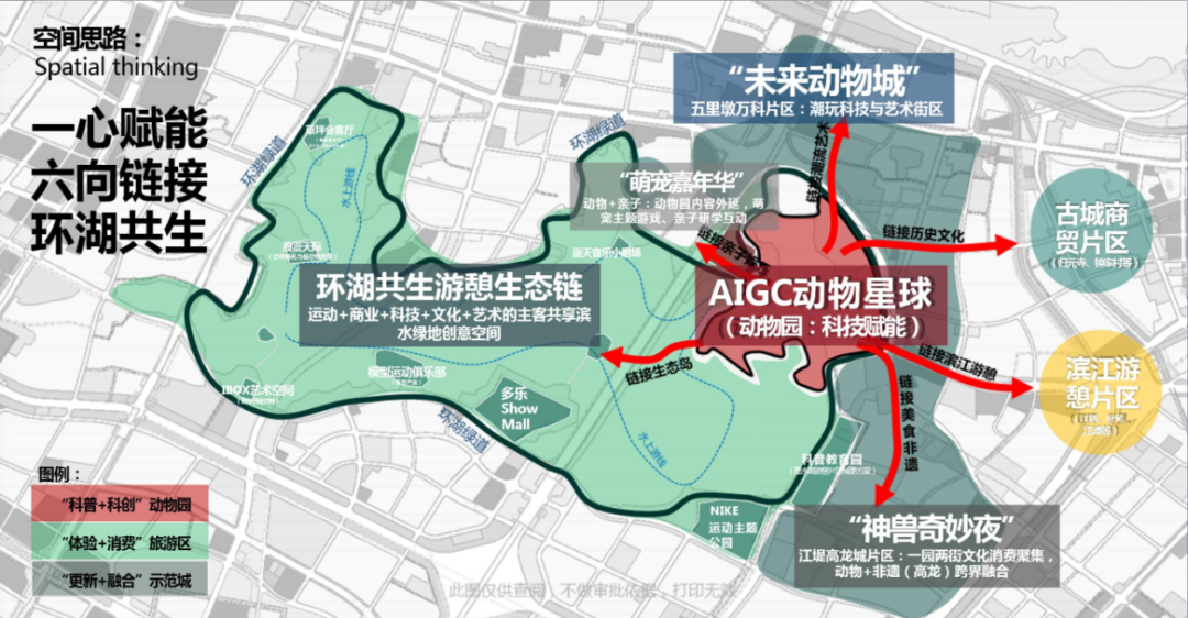 漢陽區(qū)文旅局發(fā)布環(huán)動物園文旅圈產(chǎn)業(yè)規(guī)劃,動物園片區(qū)擬圍繞“親子、運動、創(chuàng)意”三大主題詞,通過數(shù)游賦能、延鏈補(bǔ)空、引線搭橋,整合區(qū)域商文旅資源,打造“科普+科創(chuàng)”動物園、“體驗+消費”旅游區(qū)、“更新+融合”示范區(qū),形成“一心賦能、六向鏈接、環(huán)湖共生”的空間規(guī)劃思路。圍繞動物園提升打造AIGC動物星球,圍繞水路交通串聯(lián),豐富創(chuàng)意體驗空間,形成環(huán)湖共生游憩生態(tài)鏈。讓環(huán)動物園文旅圈形成“以文旅帶流量、以場景促產(chǎn)業(yè)”的引領(lǐng)效應(yīng)。