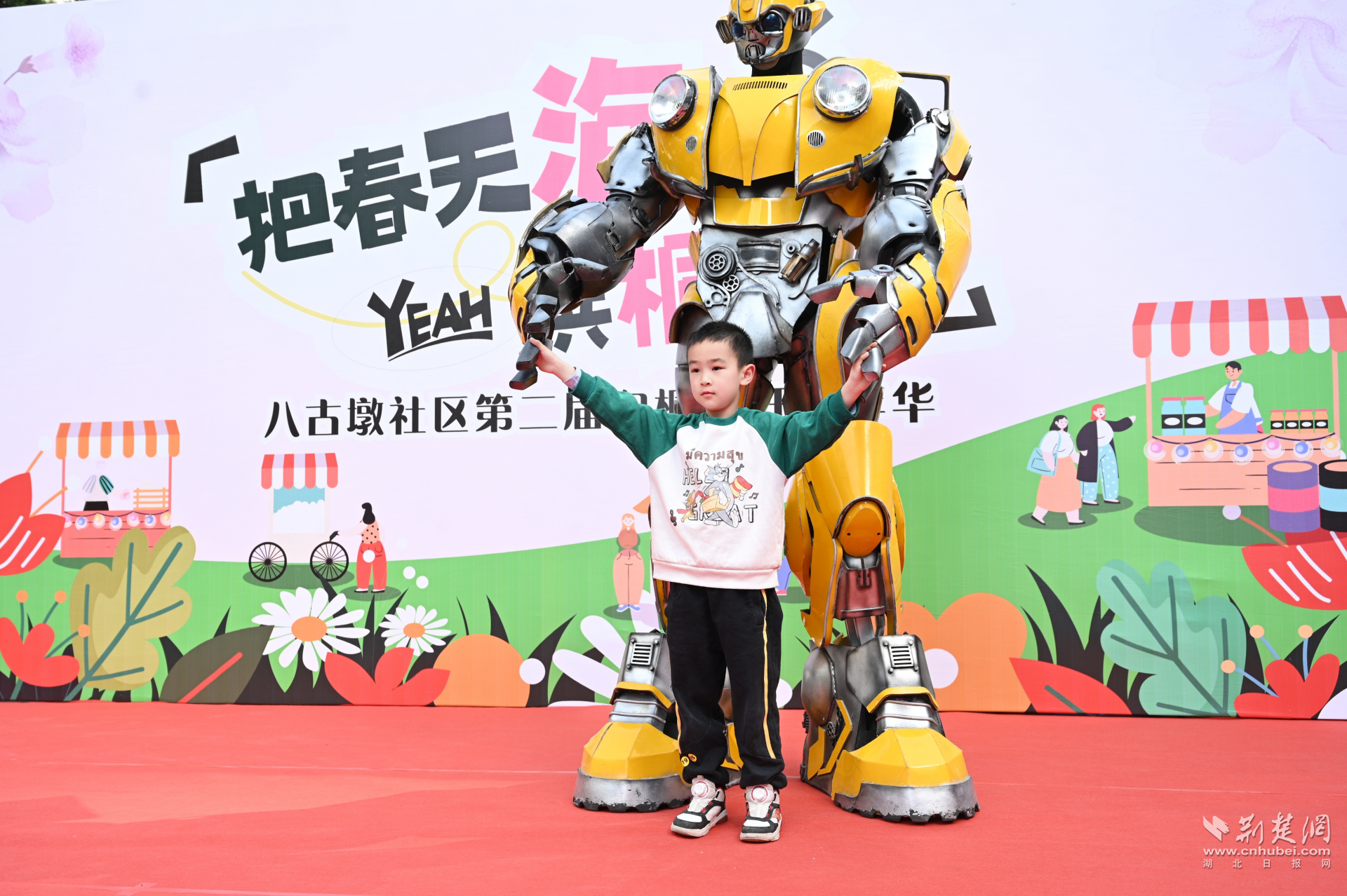 全民共建聚合力?;顒踊I備階段,社區(qū)黨委充分發(fā)揮居民議事會作用,發(fā)動30余名居民志愿者成立策展專班。轄區(qū)居民羅先生主動請纓,免費贊助大黃蜂機器人、小丑巡游等氛圍裝置,并與社區(qū)文藝團隊自編自演的5支主題舞蹈形成創(chuàng)意碰撞。當(dāng)三米高的炫酷機器人牽手小丑姑娘巡游時,現(xiàn)場瞬間化作歡樂海洋,居民們爭相與巡游隊伍合影,自發(fā)在朋友圈發(fā)起“泡桐花下的奇遇”話題互動,活動未半已收獲上百人次線上傳播。