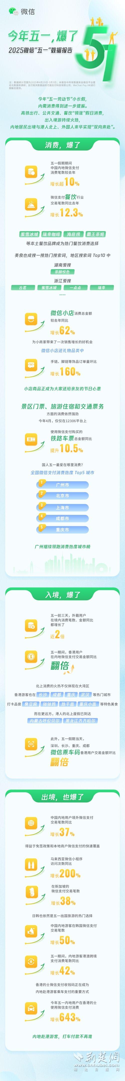 同時(shí),外國(guó)人來(lái)華、港人北上同樣火熱。微信支付外卡數(shù)據(jù)顯示,今年五一前三天,外籍用戶在境內(nèi)消費(fèi)筆數(shù)、金額同比都增長(zhǎng)了近2倍。