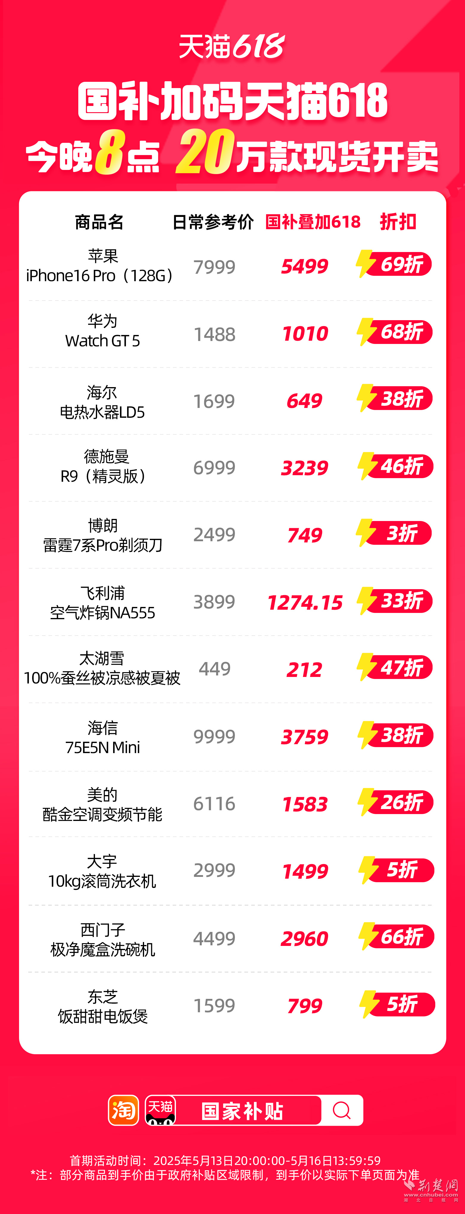 蘋果直降2000元,iPhone16 Pro首次進入國補,到手價5499元。大宇10公斤滾筒洗衣機,國補疊加618優(yōu)惠,打5折,到手價1499元;美的節(jié)能空調(diào),打35折,到手價1583元;75寸Mini LED海信電視,打38折,補貼后到手價3759元;西門子極凈魔盒洗碗機,打66折,到手價2960元;東芝飯?zhí)鹛痣婏堨?,?折,到手價799元。