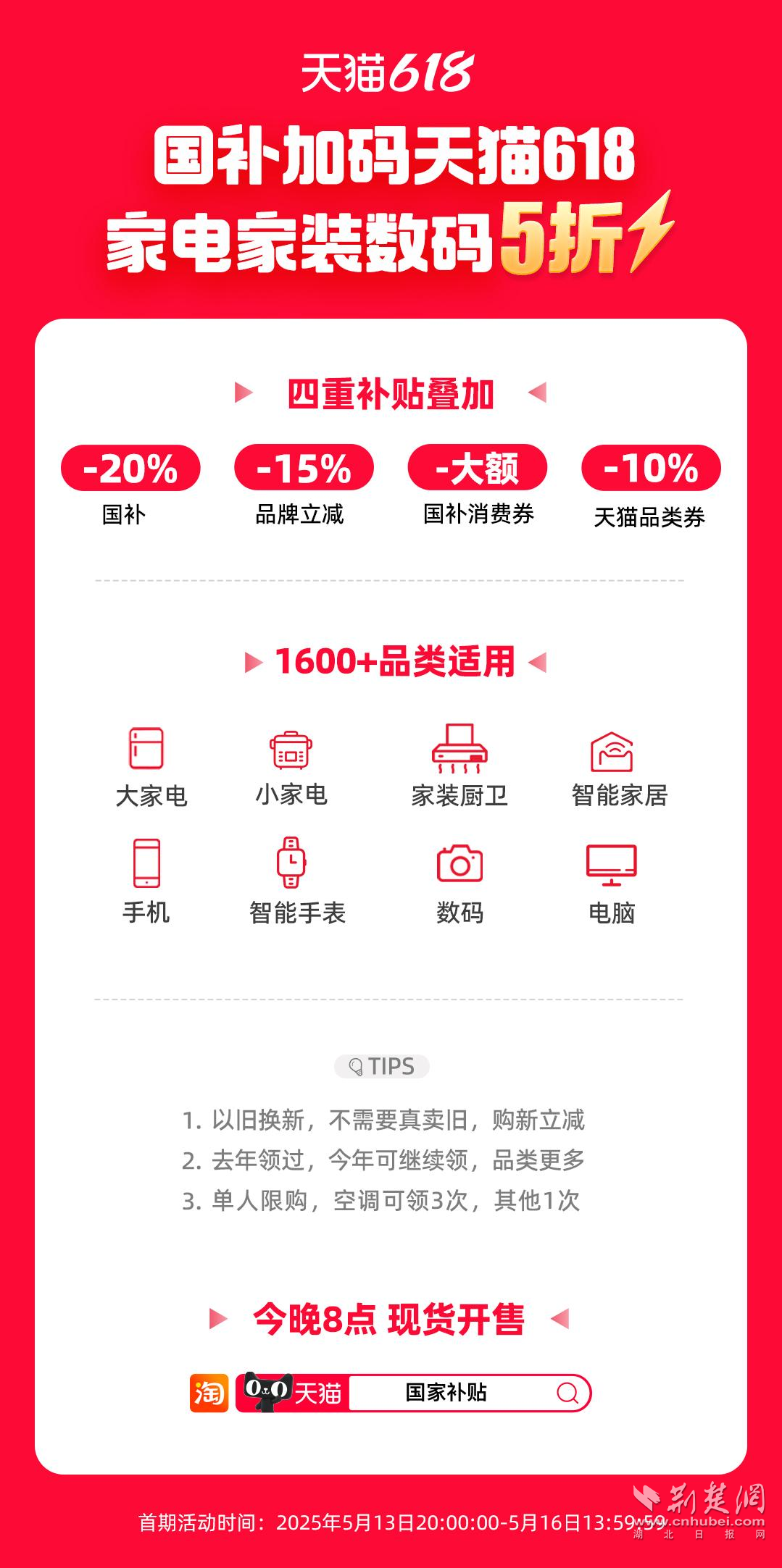 荊楚網(wǎng)(湖北日報網(wǎng))訊(通訊員 朱飛)天貓618重磅加碼國補,家電、家裝、家居、3C數(shù)碼等品類將低至5折,今晚8點,現(xiàn)貨開賣。