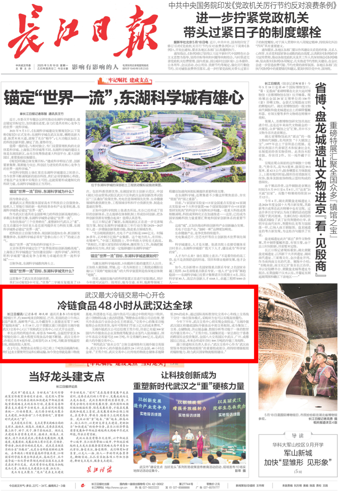 冷庫卷閘門緩緩打開,約3000噸來自阿根廷、巴西、美國(guó)的進(jìn)口牛肉以及國(guó)產(chǎn)禽類、海鮮等產(chǎn)品,從冷藏貨車上直接送至零下18℃的“超級(jí)冰箱”。5月18日,位于黃陂區(qū)灄口街道的玉湖冷鏈(武漢)交易中心(以下簡(jiǎn)稱武漢交易中心)正式開倉運(yùn)營(yíng),這也是華中地區(qū)單體最大的冷鏈交易中心首倉。