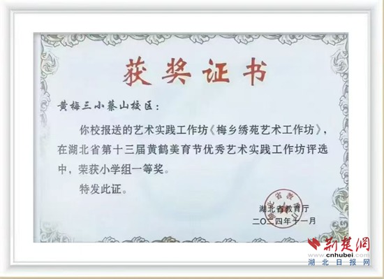 “讓孩子們從小學(xué)習(xí)挑花技藝,不能讓傳統(tǒng)技藝失傳,同時(shí)通過挑花活動培養(yǎng)孩子們靜下心來專注做事的良好品質(zhì)?!蓖趺粽f。2024年秋,學(xué)校“梅鄉(xiāng)繡苑”挑花工作坊帶著師生挑繡的作品參加湖北省第十三屆黃鶴美育節(jié),榮獲藝術(shù)實(shí)踐工作坊一等獎(jiǎng)。