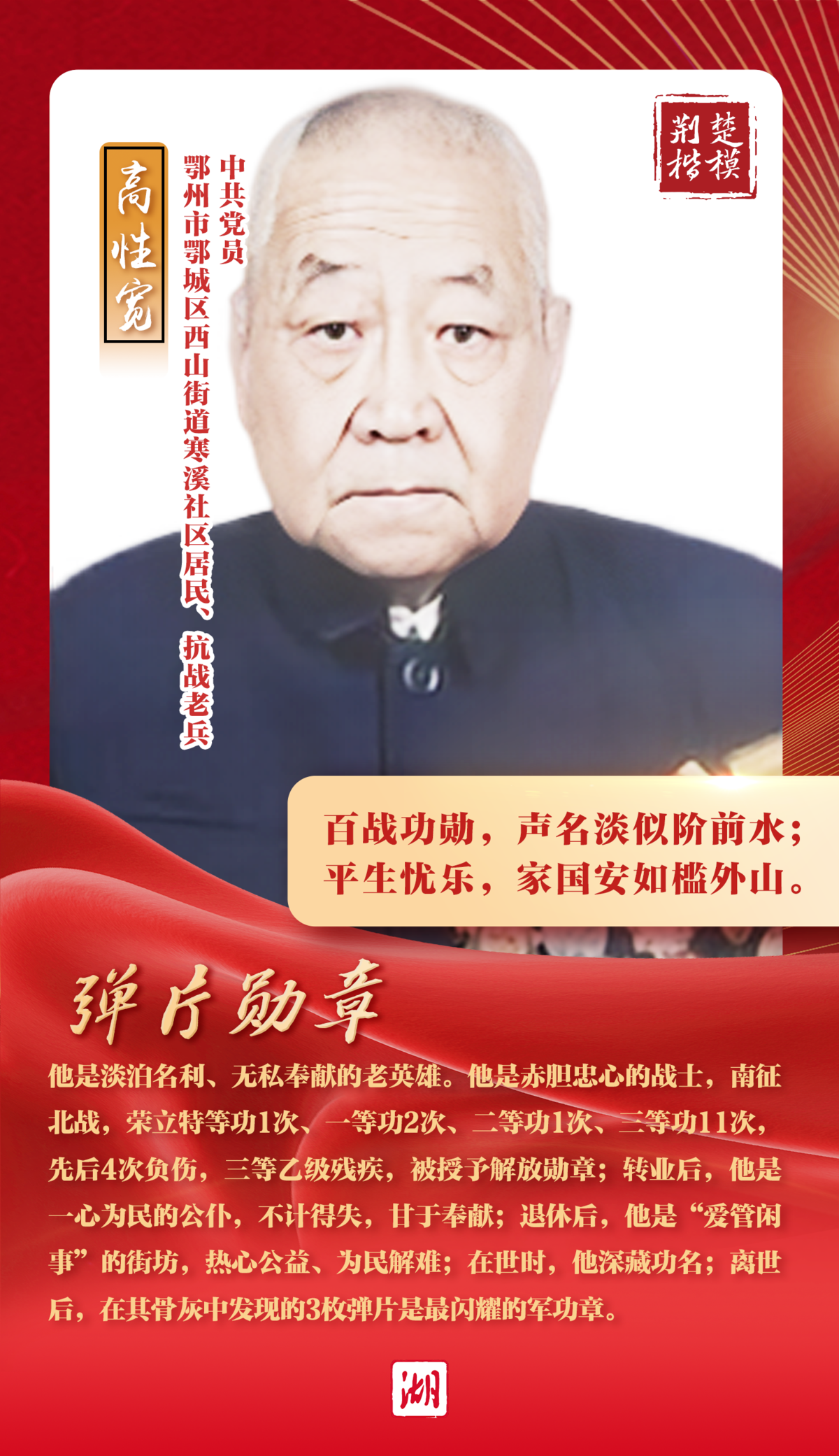 他是淡泊名利、無私奉獻(xiàn)的老英雄。他是赤膽忠心的戰(zhàn)士,南征北戰(zhàn),出生入死,榮立特等功1次、一等功2次、二等功1次、三等功11次,先后4次負(fù)傷,三等乙級(jí)殘疾,被授予解放勛章;轉(zhuǎn)業(yè)后,他是一心為民的公仆,不計(jì)得失,甘于奉獻(xiàn);退休后,他是“愛管閑事”的街坊,熱心公益、為民解難。在世時(shí),他深藏功名;離世后,其骨灰中發(fā)現(xiàn)的3枚彈片是最閃耀的軍功章。