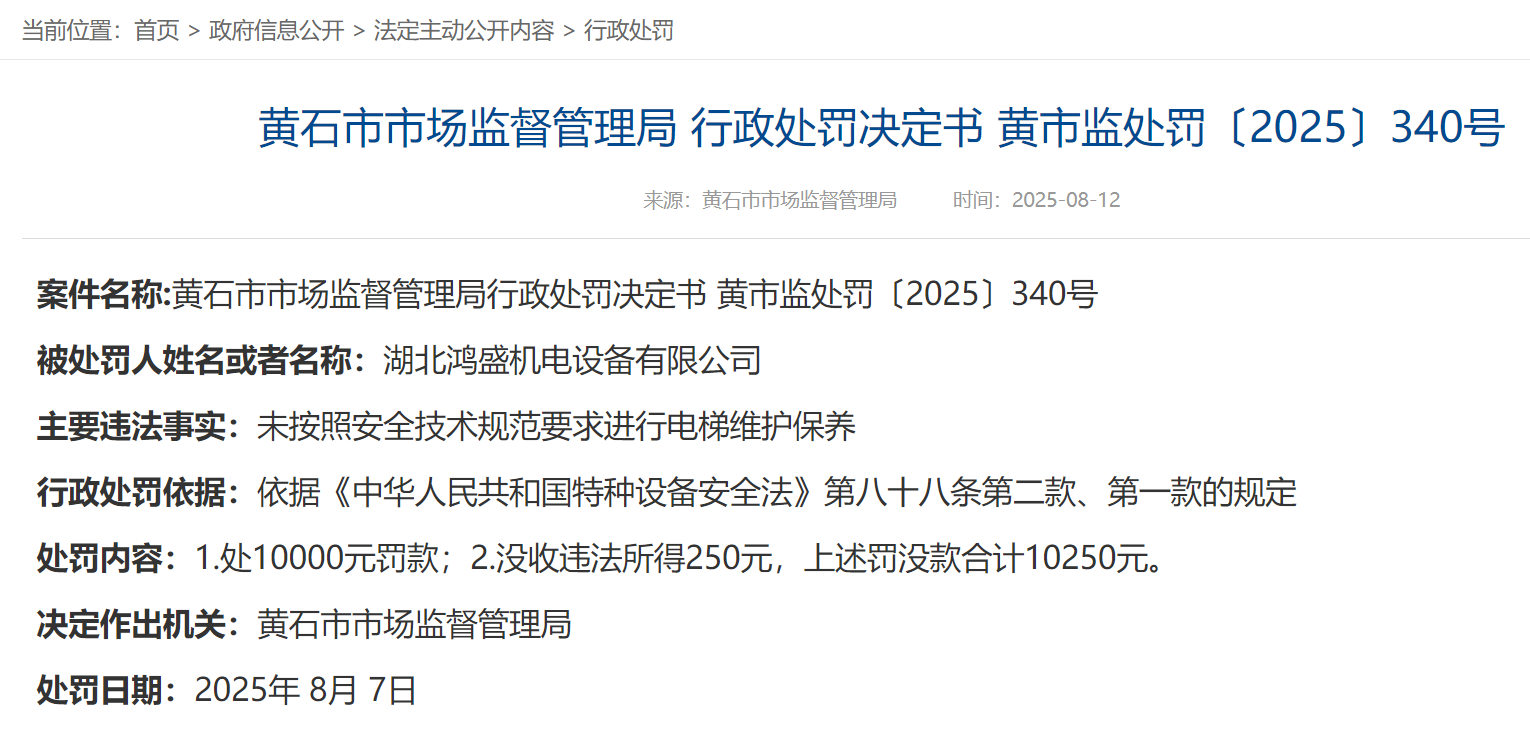 公告顯示,三家受處罰企業(yè)分別為湖北鴻盛機(jī)電設(shè)備有限公司、黃石市中信電梯工程有限公司和深圳市開元科創(chuàng)樓宇科技有限公司。主要違法事實(shí)均為“未按照安全技術(shù)規(guī)范要求進(jìn)行電梯維護(hù)保養(yǎng)”。依據(jù)《中華人民共和國特種設(shè)備安全法》第八十八條第二款、第一款的規(guī)定,黃石市市場監(jiān)督管理局在統(tǒng)一作出處10000元罰款的同時(shí),還分別對三家違法企業(yè)分別處以沒收違法所得250元、258.33元、282.27元。