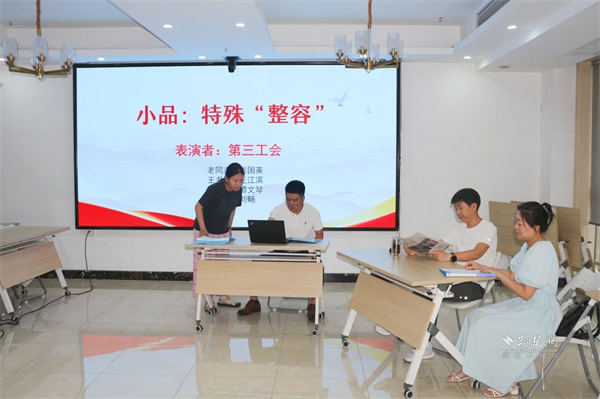 才藝展示團隊賽環(huán)節(jié),《心靈美容院》《“照鏡子 正衣冠”研討會》《特殊整容》等精彩節(jié)目輪番上演。黨群干部通過小品、朗誦、合唱等多元形式,生動呈現(xiàn)在思想引導(dǎo)、作風建設(shè)和團隊凝聚中的實踐與思考,剖析了工作中的“痛點”“堵點”,映射出黨群工作者直面問題的工作實效。