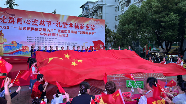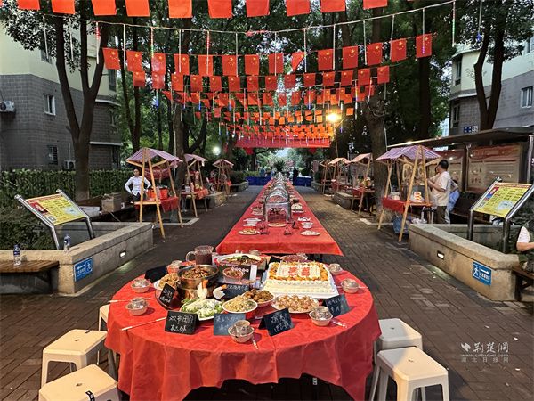 活動中,文藝表演與互動環(huán)節(jié)穿插進行,帥鼓《歌唱祖國》、民樂《地道戰(zhàn)》、黃梅戲《再唱山歌給黨聽》輪番上演。當54平方米的巨幅國旗緩緩展開,居民們揮舞小國旗齊唱贊歌,手中的紙飛機帶著美好祝愿飛向夜空,電子煙花綻放的瞬間,現(xiàn)場氣氛達到高潮。此外,三輪抽獎、“最受歡迎菜品”評選等環(huán)節(jié),更讓活動充滿驚喜與趣味。