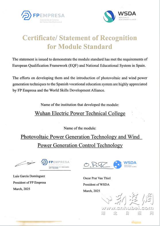 荊楚網(wǎng)(湖北日?qǐng)?bào)網(wǎng))訊(通訊員 陳書(shū)雨)當(dāng)前全球能源結(jié)構(gòu)加速向可再生能源轉(zhuǎn)型,跨國(guó)技術(shù)協(xié)作與職業(yè)教育標(biāo)準(zhǔn)互通,已成為推動(dòng)能源產(chǎn)業(yè)高質(zhì)量發(fā)展的關(guān)鍵紐帶。9月26日,國(guó)網(wǎng)湖北技培中心(武漢電院)(以下簡(jiǎn)稱“技培(電院)”)“西班牙國(guó)家課程標(biāo)準(zhǔn)及數(shù)字化課程開(kāi)發(fā)項(xiàng)目”關(guān)鍵節(jié)點(diǎn)落地,成功完成《光伏發(fā)電技術(shù)》《風(fēng)力發(fā)電控制技術(shù)》兩門(mén)課程跨國(guó)培訓(xùn)直播,這一里程碑事件標(biāo)志著技培(電院)自主研發(fā)的兩門(mén)課程標(biāo)準(zhǔn)正式輸出西班牙,為中西能源職教合作搭建起全新橋梁。