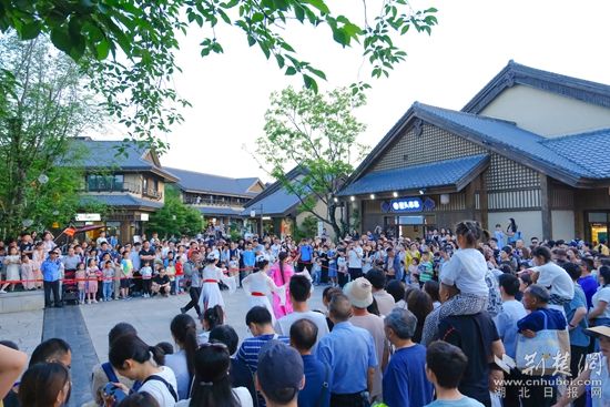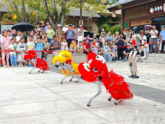 白天,智能機(jī)器人登臺(tái)唱起經(jīng)典黃梅戲,聲聲入耳;靈活的機(jī)器狗躍動(dòng)翻騰,引得觀眾連連喝彩。機(jī)器人巡游隊(duì)伍更是“身懷絕技”,握手、跳舞等表演樣樣在行,游客爭(zhēng)相互動(dòng)合影。