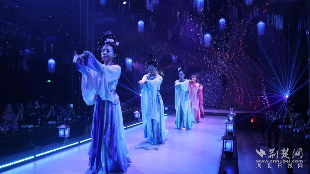 傳統(tǒng)文化的“破圈”還體現(xiàn)在味覺與視覺的融合中。黃梅戲主題餐秀綜合體“黃梅宴”內(nèi),新編劇目《天仙奇緣》與美食同步呈現(xiàn)。食客夾起黃梅魚面時(shí),舞臺(tái)上的“七仙女”便踏云步至席間,婉轉(zhuǎn)唱段與餐香交織,讓味蕾與聽覺同時(shí)“入戲”?!霸緦?duì)黃梅戲不太了解,這場(chǎng)表演既有古典韻味,又充滿現(xiàn)代氣息,看得非常過癮。”市民石海珠觀演后贊嘆。