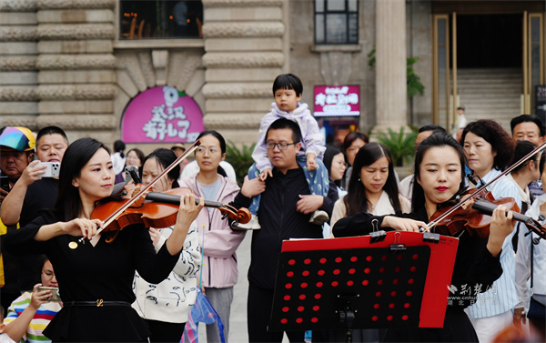 來自阿曼的游客Murad Al Balushi難掩興奮,特意讓朋友為自己和樂團拍下合影?!斑@場演出太精彩了,現(xiàn)場的氛圍讓人沉醉,武漢街頭的這份浪漫很獨特?!盡urad Al Balushi表示。來自廣東珠海的游客曹先生,剛下火車便將江漢路作為旅途第一站,而這場音樂快閃成為他此行的意外之喜?!案哐乓魳放渖习倌赙姌堑膹?fù)古建筑,氛圍感直接拉滿,這趟旅行的開頭太完美了?!蔽錆h市民李女士帶著家人在休息日出游,剛從公交站下車就被樂聲吸引,“本來就是隨便逛逛,正好帶著寶寶感受一下音樂氛圍?!苯瓭h大學(xué)大四學(xué)生小劉和朋友一同被這場音樂“快閃”所打動,拍下視頻發(fā)朋友圈和大家分享。她表示:“武漢這座城市越來越有活力,總能給人驚喜?!?/p>
