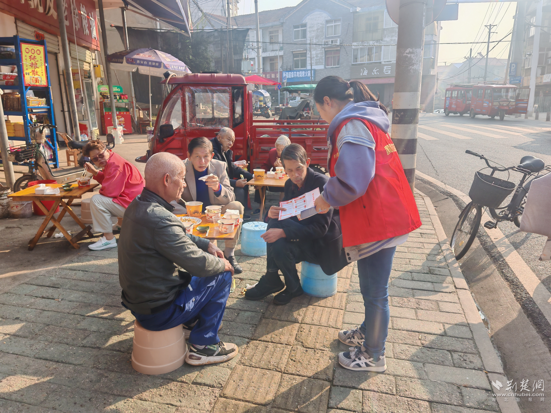 社區(qū)工作人員在黃陵市場內(nèi)發(fā)放反詐宣傳單。通訊員供圖