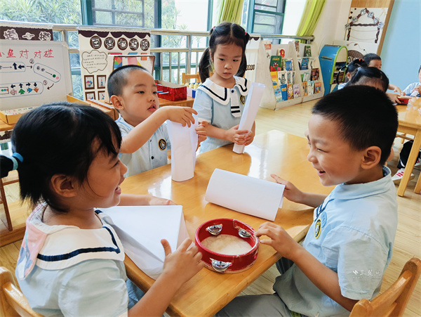 動手環(huán)節(jié)點燃孩子們的熱情,四人一組的小隊伍里,小朋友們手握A4紙、膠帶躍躍欲試,有的反復卷緊紙張,力求讓紙筒更厚實;有的湊著腦袋和伙伴商量,給紙筒底部貼“小支架”增強穩(wěn)定性。課堂里,剪刀裁剪聲、膠帶粘貼聲伴著小聲討論,專注的小身影構(gòu)成了熱鬧又溫馨的畫面。