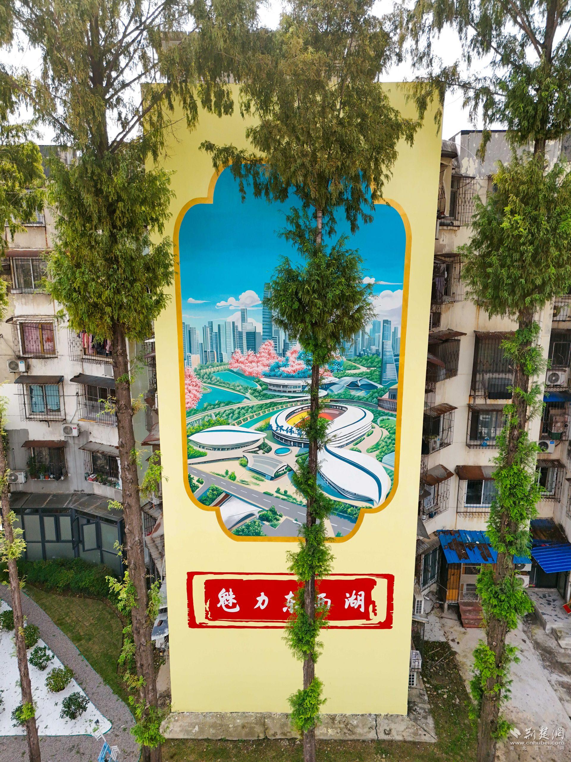圍墻和彩繪也成了亮點(diǎn)。專業(yè)團(tuán)隊(duì)在相鄰居民樓外墻繪制325平方米主題壁畫——一面呈現(xiàn)“魅力東西湖”的城市風(fēng)貌,一面展現(xiàn)“幸福新常青”的生活圖景,成為社區(qū)新地標(biāo)。