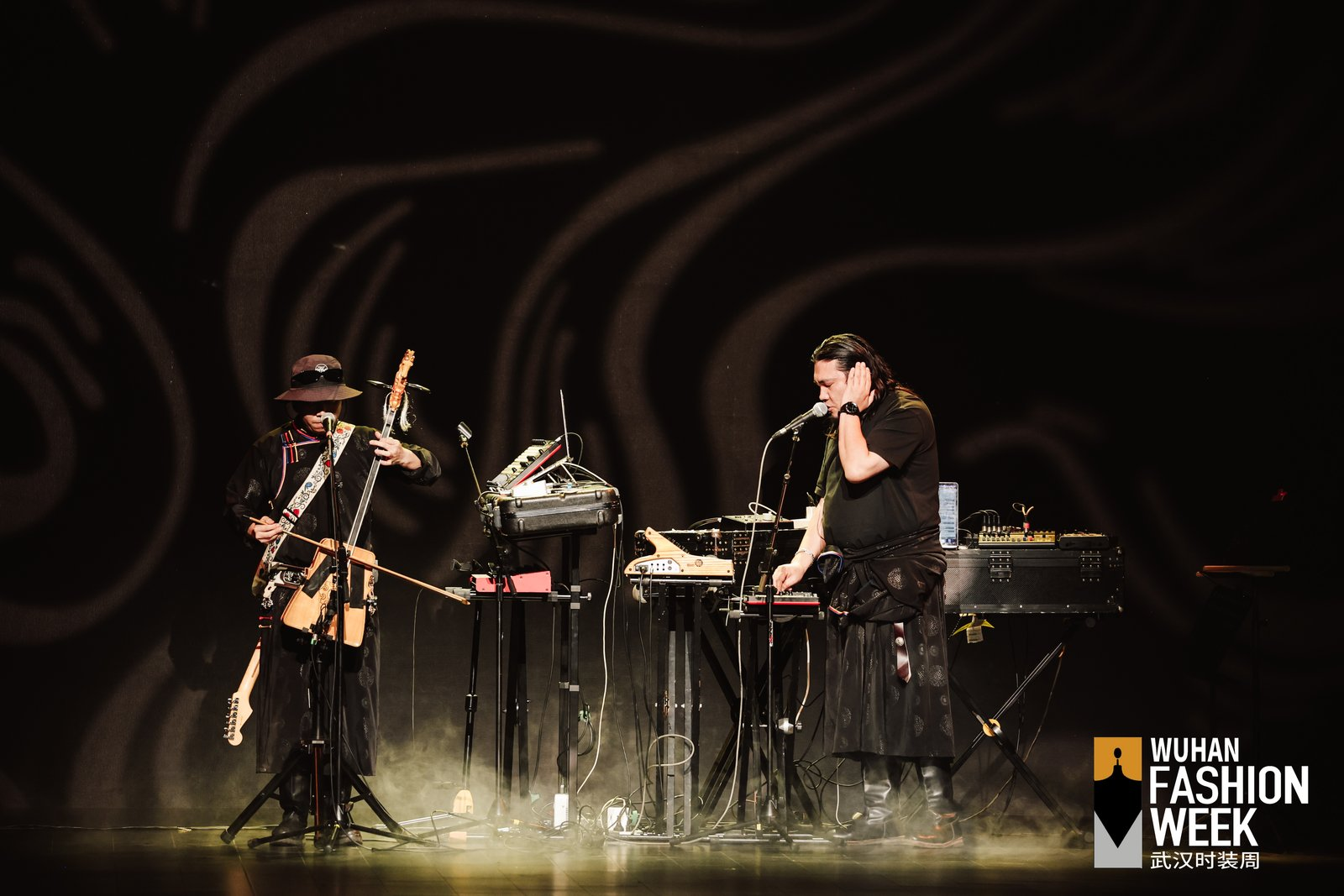 陳宇攜手Taiga樂隊(duì),把錫林郭勒草原的晨霧、馬頭琴與電子節(jié)拍轉(zhuǎn)化成可行走的時(shí)裝音景。可持續(xù)植物素皮、流蘇與繩結(jié)形成呼應(yīng),讓游牧精神在當(dāng)代廓形中保持自由。