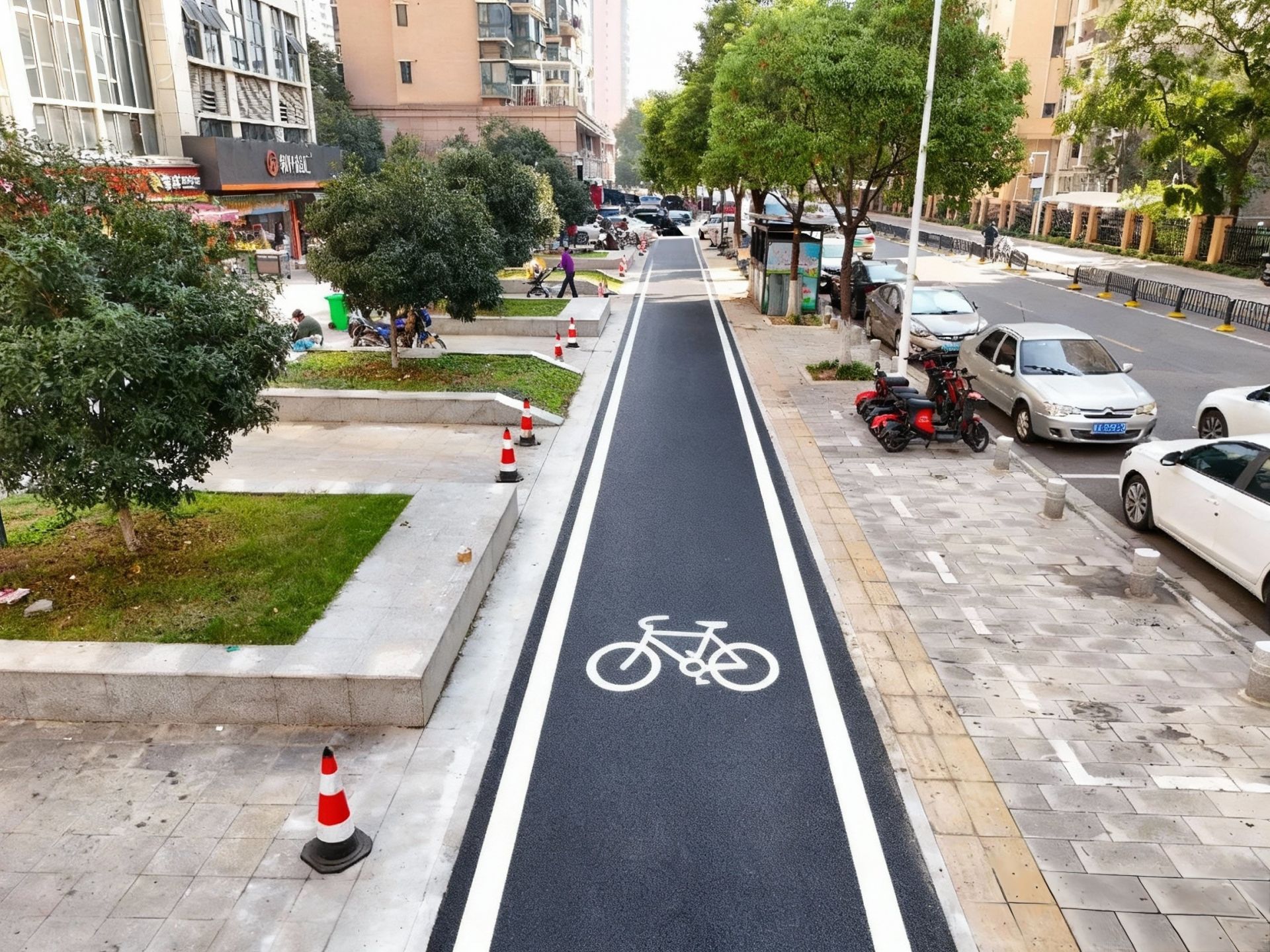 路面平整之后,還劃上了清晰的非機(jī)動車道標(biāo)線,人車分流,騎行、步行互不干擾。同時,為了防止機(jī)動車占道,沿線還加設(shè)了8處阻車樁,機(jī)動車再也不能“霸占”人行道了。