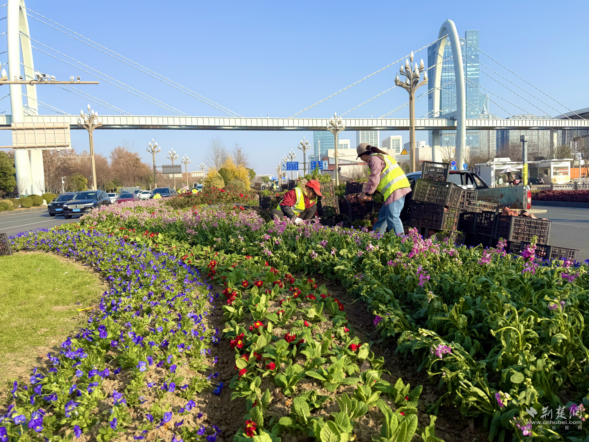 在城市主干道和重要節(jié)點(diǎn),節(jié)日花卉景觀已陸續(xù)亮相。高新大道、光谷廣場(chǎng)等核心路段,約7300平方米的三色堇、角堇、石竹等時(shí)令花卉集中綻放,色彩層次分明,形成綿延不斷的“城市花帶”。在光谷同濟(jì)醫(yī)院周邊、光谷一路等區(qū)域,600平方米的精致花境點(diǎn)綴街角,與城市空間自然融合,為市民日常出行增添亮色。