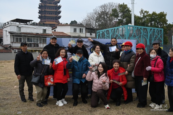 快閃活動選址社區(qū)黃鶴游園,抬頭即見巍巍黃鶴樓?,F(xiàn)場,82歲守井人謝邦純老人與社區(qū)工作人員、青年學(xué)子一同講述“三井一臺”的故事,帶領(lǐng)在場居民穿越時空,觸摸楚王府遺韻與市井生活記憶。