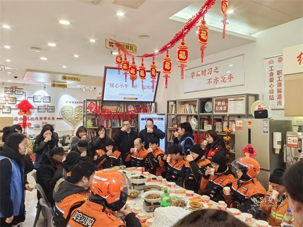 荊楚網(wǎng)(湖北日報網(wǎng))訊(通訊員 趙坤 童霞)2月10日農(nóng)歷小年,武昌區(qū)南湖街道工會聯(lián)合中央花園社區(qū)、寶安社區(qū)在南湖街新就業(yè)群體服務(wù)工會驛站開展“暖心小年,‘驛’起團(tuán)圓”活動,邀請外賣小哥、快遞員、環(huán)衛(wèi)工人等20余名戶外勞動者歡聚一堂,寫福字、玩游戲、吃團(tuán)圓宴,在歡聲笑語中,感受工會“娘家人”的溫暖。