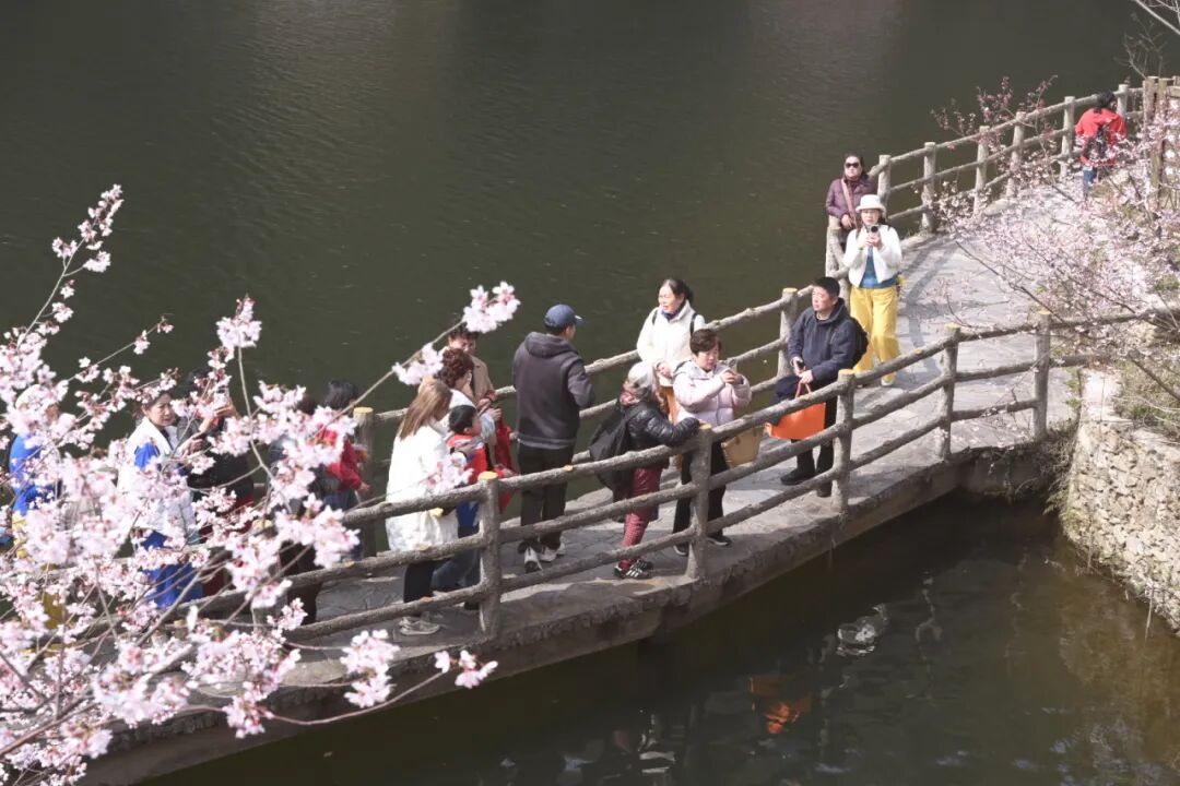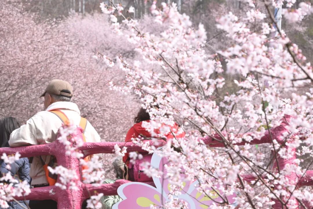 步入景區(qū),綿延道路兩側(cè)櫻花成廊,花枝交錯如云似霞。層層花瓣在陽光下熠熠生輝,粉白相間、隨風(fēng)輕搖,勾勒出如夢似幻的春日盛景。游客們漫步其間,拍照打卡、駐足欣賞,在山野間沉浸式感受櫻花與春光的雙重浪漫。