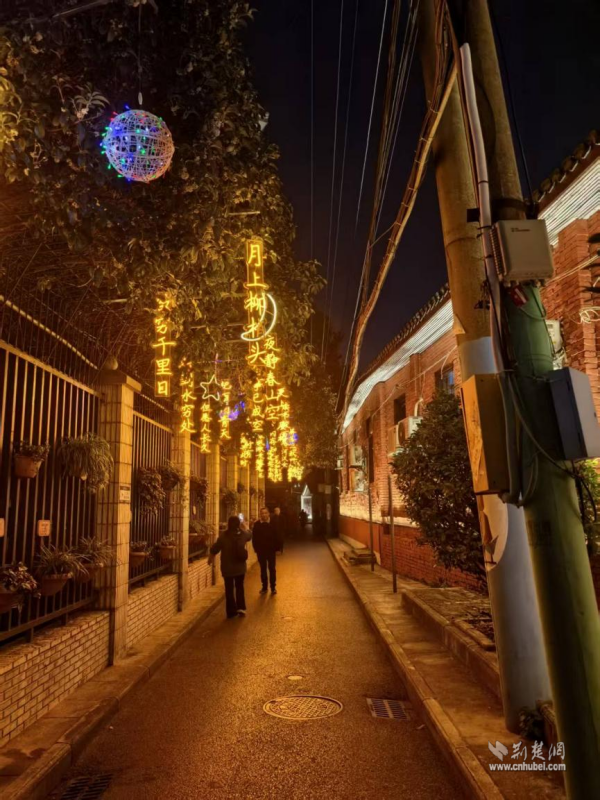 這個(gè)由社區(qū)與共建單位湖北省農(nóng)業(yè)事業(yè)發(fā)展中心共同策劃改造的“詩詞長廊”,創(chuàng)新融合了詩詞文化與光影藝術(shù)。夜幕降臨,一盞盞詩詞燈帶悄然亮起。柔和光暈下,“晴川歷歷漢陽樹,芳草萋萋鸚鵡洲”的古韻與墻上“蒜鳥”“七飯”等俏皮的武漢方言點(diǎn)綴其間,歷史與當(dāng)下在光影交錯(cuò)間完成了隔空對(duì)話。