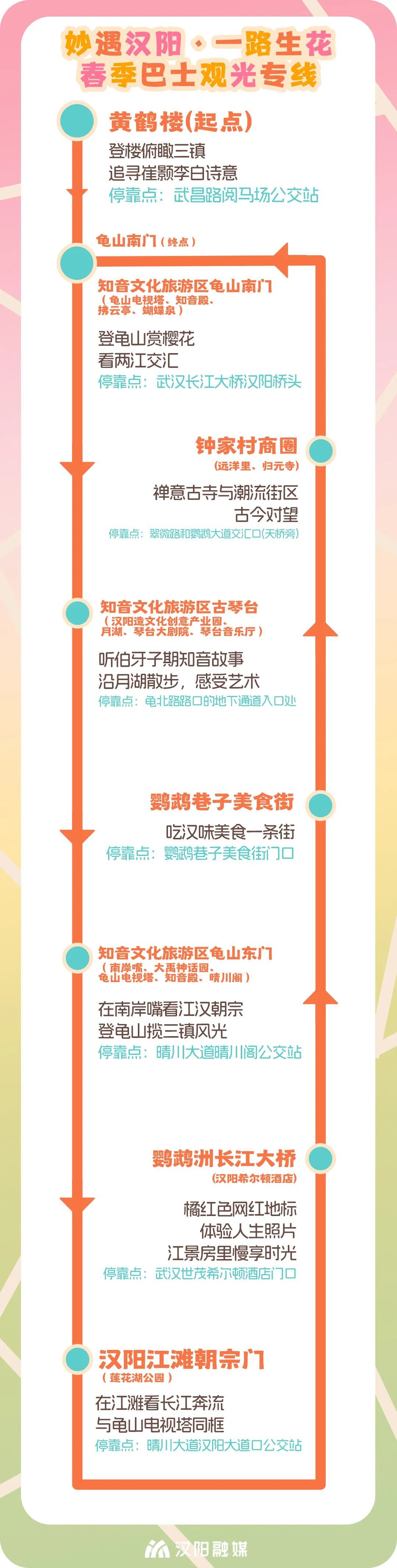 春季觀光巴士線路深融全市“江漢攬勝”主題游線,以黃鶴樓為起點、龜山南門為終點,串聯(lián)龜山、古琴臺、晴川閣等15處文旅景點及鐘家村、遠洋里2大商圈,實現(xiàn)文旅地標與消費場景的一站式無縫銜接。每處??奎c都設置有醒目的粉紅色站點導視牌,市民游客預約成功后,可在此候車,也可向站點處的志愿者咨詢。