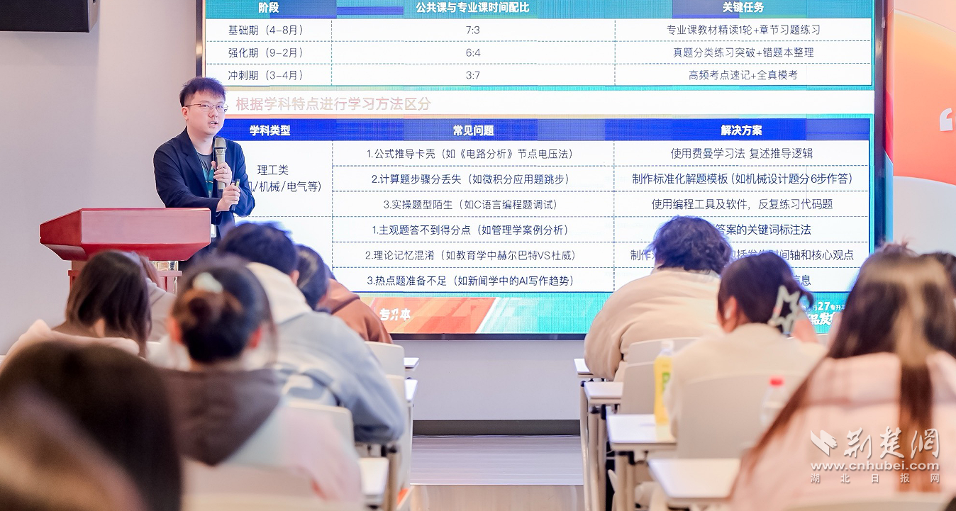 備考先知情,方能贏在起點。發(fā)布會上,教學(xué)負責(zé)人胡誠林,圍繞湖北省專升本公共課考情回顧及2027備考規(guī)劃展開詳細分享。他重點拆解了《大學(xué)英語》這一核心公共課的考試要求、題型迭代規(guī)律及難度變化趨勢,針對考生最關(guān)心的詞匯積累、語法掌握、閱讀理解、書面寫作四大模塊,提供了可落地、可執(zhí)行的備考策略。從詞匯記憶的高效方法、語法考點的重點突破,到閱讀技巧的精準運用、寫作能力的分層提升,胡誠林老師進行了全方位、系統(tǒng)化的解析,為考生搭建起清晰的公共課備考框架,幫助大家精準把握備考節(jié)奏,做到游刃有余。