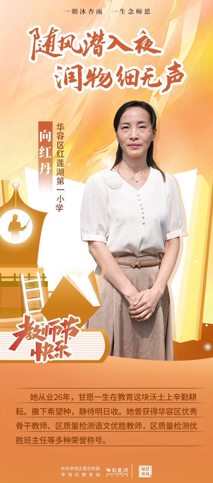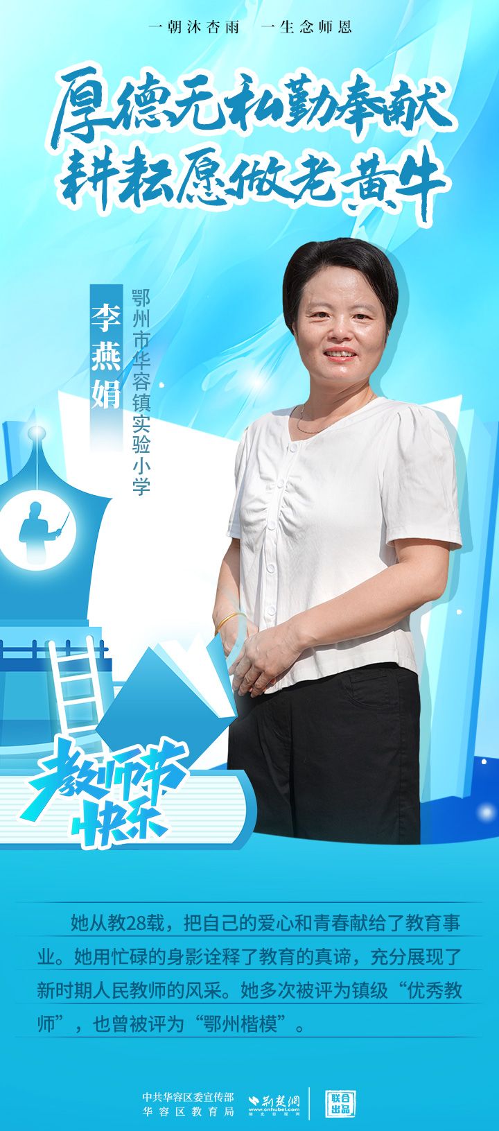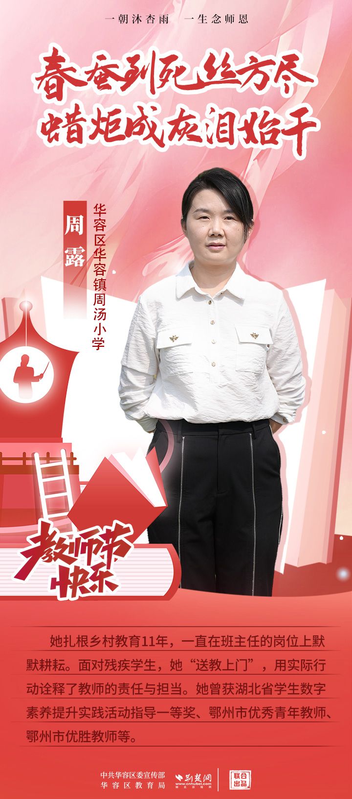 荊楚網(wǎng)(湖北日報網(wǎng))訊(記者 劉璐 通訊員 張曉琴)百年大計,教育為本;教育大計,教師為本。在教師節(jié)來臨之際,中共華容區(qū)委宣傳部聯(lián)合荊楚網(wǎng)(湖北日報網(wǎng))推出創(chuàng)意海報,姜海燕、廖進等6名老師入選“荊楚好老師”群星計劃。她們?彰顯了新時代教師的風采,?為教育事業(yè)的發(fā)展貢獻了重要力量?,向了不起的她們致敬!