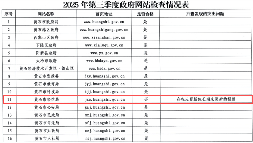 荊楚網(wǎng)(湖北日報網(wǎng))訊(記者 呂鑒蕾)記者24日獲悉,日前,黃石市政務(wù)服務(wù)管理局組織開展了2025年第三季度全市政府網(wǎng)站與政務(wù)新媒體檢查。其中,黃石市經(jīng)信局官網(wǎng)和“生態(tài)洋港”公眾號因日常維護管理不到位被點名。