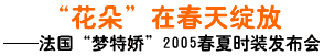 2005年4月5日,源自“時尚之都”巴黎的經(jīng)典法國時裝品牌夢特嬌,于春天伊始在武漢香格里拉大飯店上演一場激情四溢的時尚秀。在夢特嬌春夏時裝武漢發(fā)布會上,設(shè)計師們將經(jīng)典、動感和優(yōu)雅融入夢特嬌最新春夏亮絲時裝系列,將現(xiàn)代經(jīng)典、都市休閑魅力、動感動力、永恒經(jīng)典和瑰麗高雅五大主題一一呈現(xiàn)。而那最負(fù)盛名的“花朵”標(biāo)志,則仿若今春最絢爛綻放的花朵,在展示臺上奏出一支“春天的圓舞曲”。