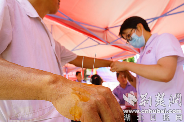 46歲的黃炳程走路時,常常用手撐著腰。今年3月,他突發(fā)腰痛?,F(xiàn)場,宜城中醫(yī)醫(yī)院針灸科主治醫(yī)師林蘭茹在其手部扎完數(shù)枚針后,他大呼止痛效果很明顯。