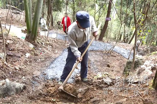 在山上的一片陡坡上,記者看到,二十多名村民正在熱火朝天地鋪路,山上不時(shí)還有來(lái)來(lái)往往爬山的村民,原來(lái),今天是該村周家灣達(dá)觀山生態(tài)休閑公園試開(kāi)放的第一天。