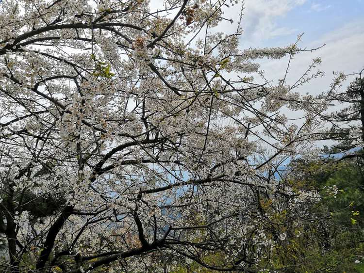 登上山頂,漫山遍野的櫻花開放在樹叢中,大幕的櫻花長(zhǎng)得特別的素雅,游客看了心中便升起一股憐愛之情。