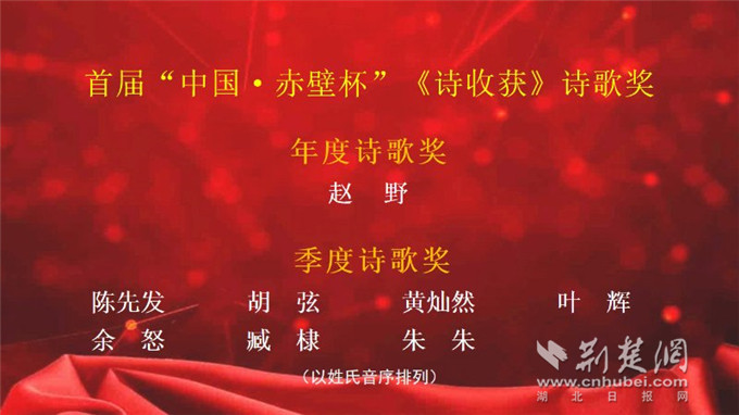 “赤壁杯”《詩(shī)收獲》詩(shī)歌獎(jiǎng)由赤壁市委宣傳部、長(zhǎng)江文藝出版社長(zhǎng)江詩(shī)歌出版中心和中國(guó)詩(shī)歌網(wǎng)聯(lián)合主辦。本屆詩(shī)歌獎(jiǎng)設(shè)“年度詩(shī)歌獎(jiǎng)”一名,獎(jiǎng)金5萬(wàn)元;“季度詩(shī)歌獎(jiǎng)”七名,獎(jiǎng)金各1萬(wàn)元。