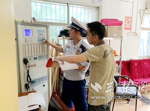 圖為消防監(jiān)督員檢查場所消防設(shè)施現(xiàn)場?!∪顣苑覕z
