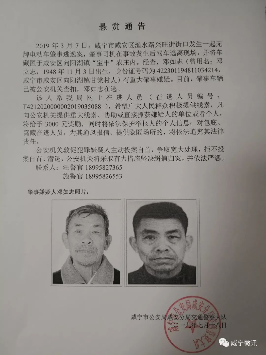 2019年3月7日,咸寧市咸安區(qū)漁水路興旺街街口發(fā)生一起無(wú)牌電動(dòng)車(chē)肇事逃逸案,肇事司機(jī)在事故發(fā)生后駕車(chē)逃離現(xiàn)場(chǎng),并將車(chē)藏匿于咸安區(qū)向陽(yáng)湖鎮(zhèn)“寶豐”農(nóng)莊內(nèi)。經(jīng)查,鄧如志(曾用名:鄧立志,1948年11月3日出生,身份證號(hào)碼為422301194811034214,咸寧市咸安區(qū)向陽(yáng)湖鎮(zhèn)甘棠村人)有重大肇事嫌疑。目前,肇事車(chē)輛已被公安機(jī)關(guān)查扣,鄧如志在逃。