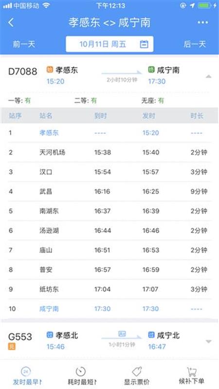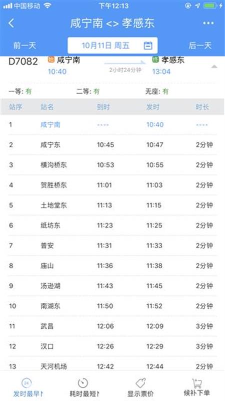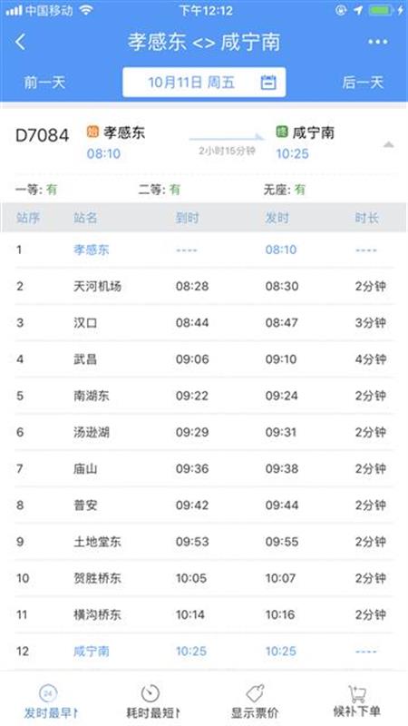10時40分從咸寧南始發(fā),沿途??肯虒帠|、橫溝橋東、賀勝橋東、土地堂東、紙坊東、普安、廟山、湯遜湖、南湖東、武昌、漢口、天河機場等站,13時04分終到孝感東站;