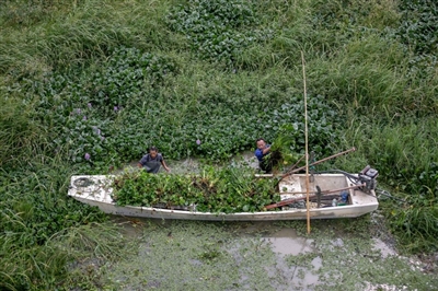 10月15日,工人們正在淦河窯嘴大橋處打撈外來物種水葫蘆。據(jù)悉,因水葫蘆繁殖過快,若成片聚集會造成水質(zhì)惡化。入夏以來,向陽湖國家濕地公園管理處將外來物種清理列為常規(guī)工作,不定期組織人員在公園內(nèi)進行打撈清除,守護一湖清水。通訊員吳濤徐元紅攝