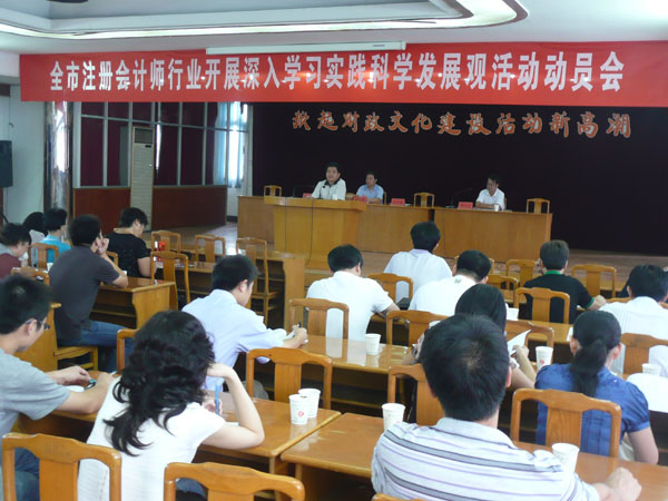 會(huì)上,市注冊(cè)會(huì)計(jì)師行業(yè)黨總支書記方曉同志宣讀了《關(guān)于全市注冊(cè)會(huì)計(jì)師行業(yè)開展深入學(xué)習(xí)實(shí)踐科學(xué)發(fā)展觀活動(dòng)的實(shí)施方案》。市內(nèi)7家會(huì)計(jì)師事務(wù)所的黨員及非黨員員工約80多人參加了會(huì)議。