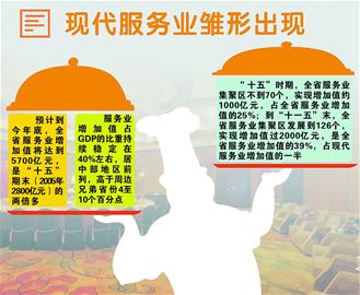 五年來,全省不斷改造提升傳統(tǒng)服務(wù)業(yè),大力發(fā)展需求潛力大的現(xiàn)代服務(wù)業(yè),鞏固提高商貿(mào)等支柱服務(wù)業(yè)的整體規(guī)模和水平,實現(xiàn)了多個新興行業(yè)和關(guān)鍵領(lǐng)域的重點突破,基本形成了二、三產(chǎn)業(yè)共同拉動經(jīng)濟(jì)又好又快增長的格局。省發(fā)改委表示,下一個5年,我省將力爭形成物流、旅游、金融、文化、信息、中介6個增加值或收入過千億元的現(xiàn)代服務(wù)業(yè)產(chǎn)業(yè),力爭服務(wù)業(yè)增加值實現(xiàn)過萬億元的突破,占全省GDP比重達(dá)到43%。